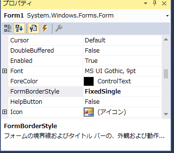 フォームのリサイズを禁止するためにプロパティウィンドウの「FormBorderStyle」を「FixedSingle」に変更します。