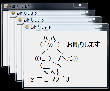 static void Main() { string text = " ハ,,ハ" + Environment.NewLine + "( ゚ω゚)" + " お断りしますが、よろしいですか?"; MessageBox.Show(text, "Windows", MessageBoxButtons.YesNoCancel); Application.EnableVisualStyles(); Application.SetCompatibleTextRenderingDefault(false); Application.Run(new Form1()); }